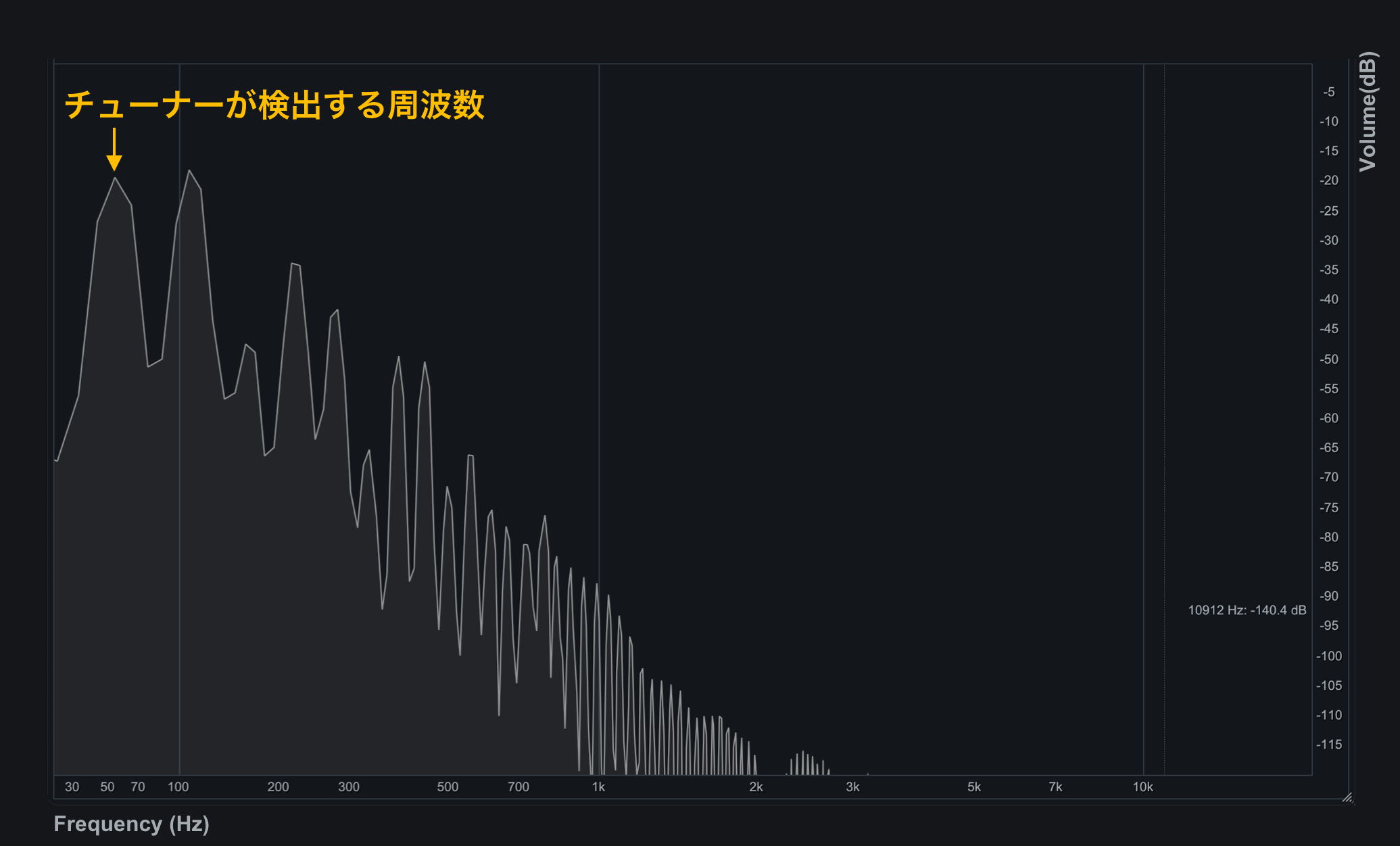 実はチューナーが検出するのはあくまでもこのうち一番低い周波数のピーク(尖った山のところ)だけで、今回だと55Hz辺りになります。